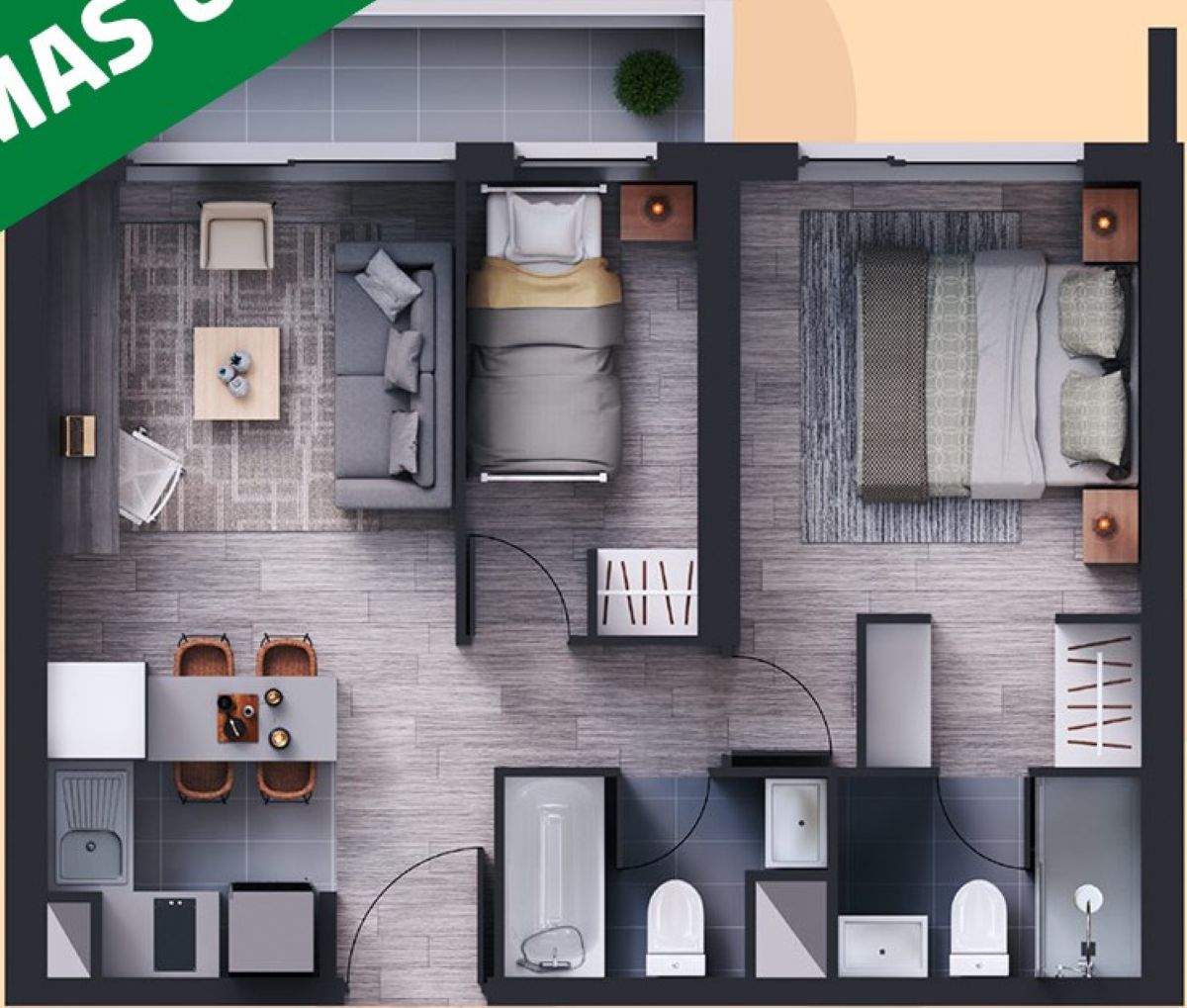 Cómodo departamento nuevo, 2 dormitorios, 2 baños, principal en suite, cocina amoblada con encimera vitrocerámica, horno eléctrico y campana, cortinas roller instaladas.