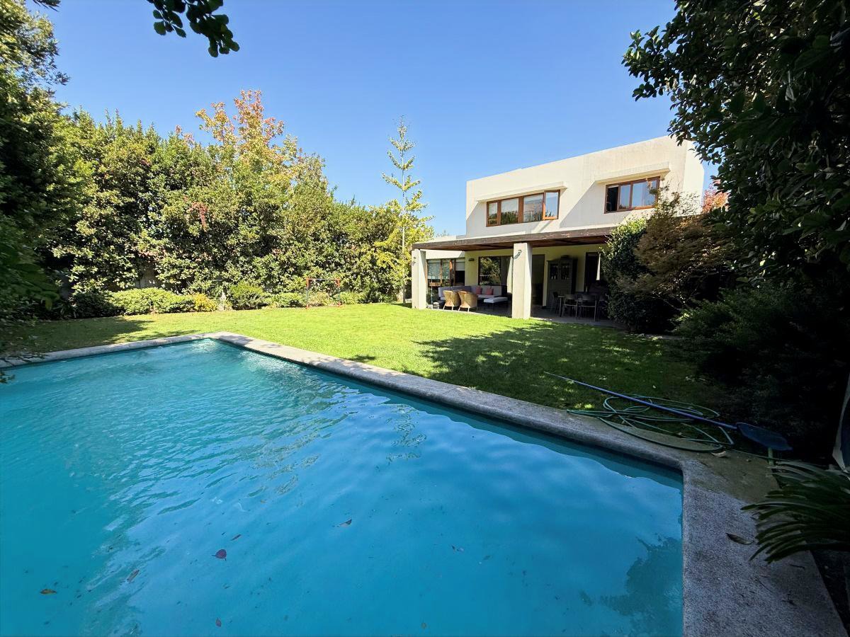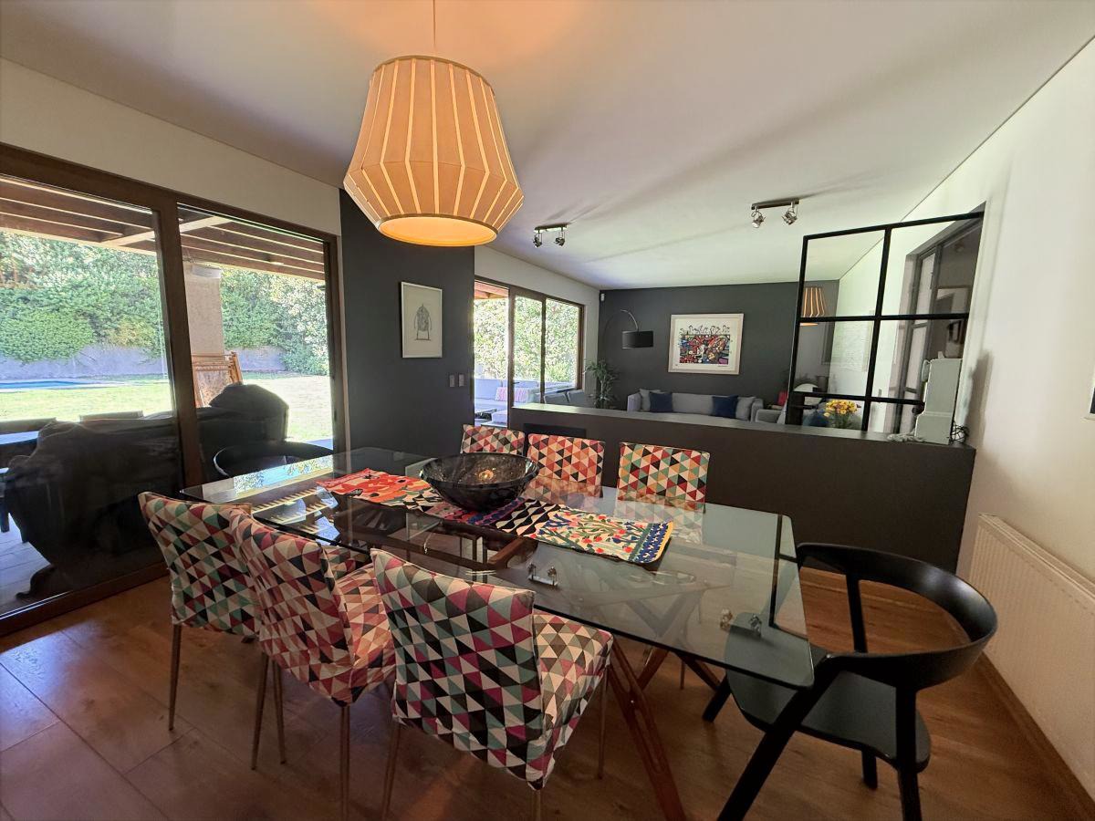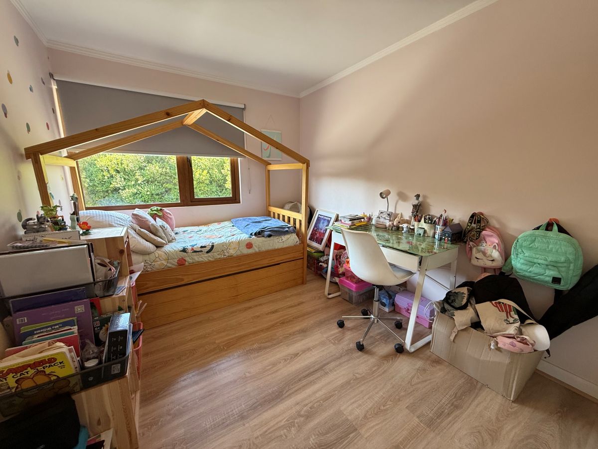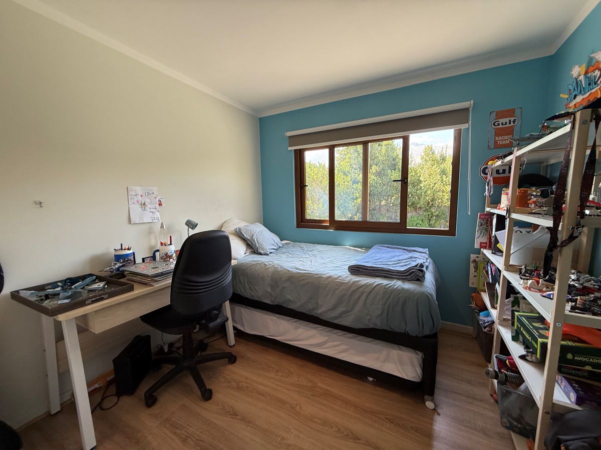 Espectacular casa familiar de dos pisos ubicada en condominio sector Piedra Roja y cercana al Colegio Alemán. De 5 dormitorios, principal en suite con walking closet y home office incorporado, 4 baños adicionales, incluyendo servicios y baño de visita, cocina totalmente equipada, sala de estar en segundo piso, gran terraza techada, amplio jardín con quincho equipado y piscina temperada, logia con almacenamiento, bodega y estacionamiento para dos automóviles. Cuenta además con sistema de calefacción vía radiadores y ventanas termopanel en toda la casa.