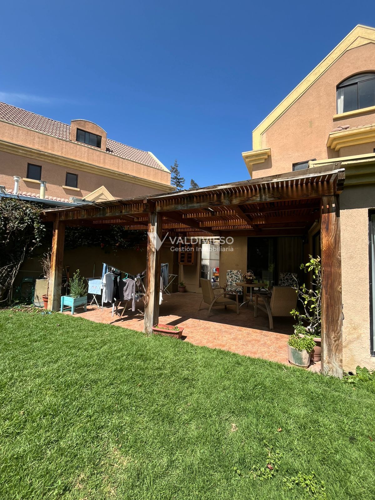 Patio: Amplia terraza techada con pino oregón, jardín y piscina.