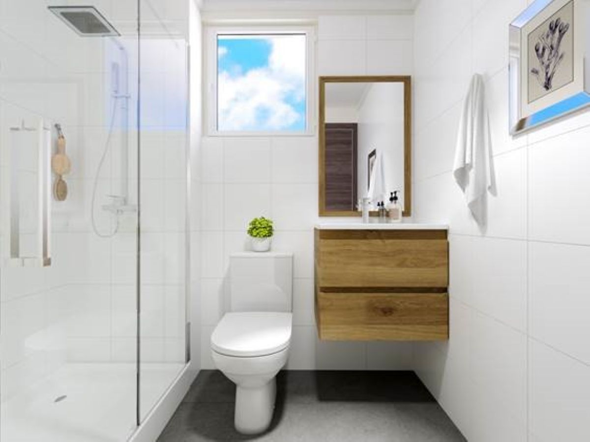 - Baños con shower doors y vanitorios con cajoneras de cierre suave.