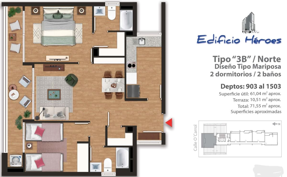 Depto 1303 UF 5.373 71,55 m2 2D 2B Estilo mariposa Orientación norte