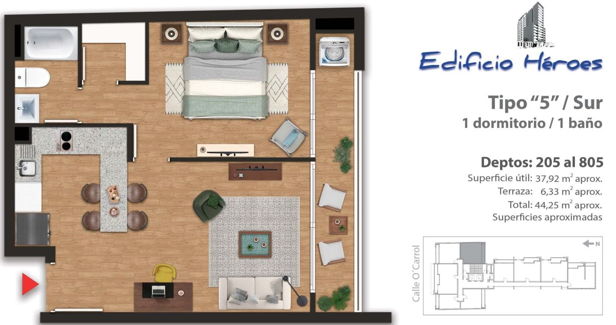 Depto 605 UF 3.198 44,25 m2 1D 1B Orientación sur