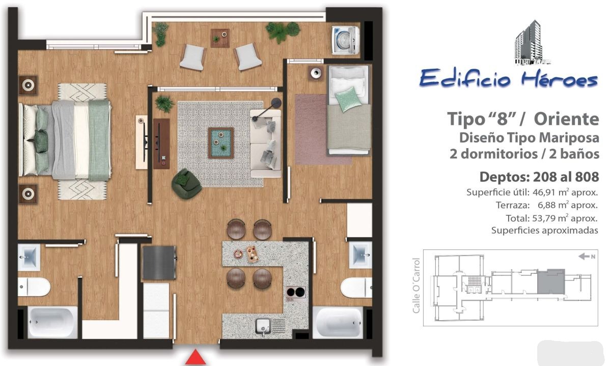 Depto 308 UF 3.886 53,79 m2 2D 2B Estilo mariposa Orientación oriente